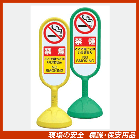 屋外用サインキュート2 表示 禁煙 ここで吸ってはいけません(英語入り) (両面) 寸法 340φ×1017mmH 色 本体:イエロー or グリーン 重量 本体:約2.0kg (満水時:約10kg) 材質 本体:高密度ポリエチレン 表示板:PET樹脂