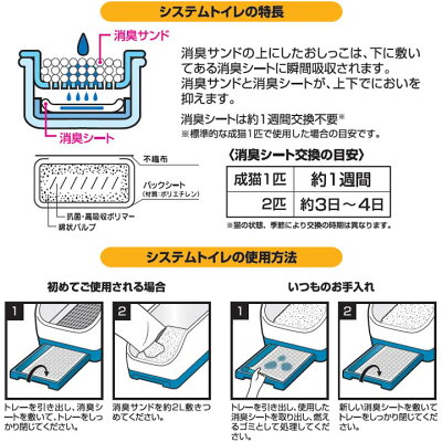 (目安) 商品仕様 素材(cm) 表面材:ポリオレフィン系不識布吸水材:吸水紙、高分子吸収体、綿状パルプ防水材:ポリエチレンフィルム接着剤:ホットメルト粘着材外装材:ポリエチレンフィルム 製品サイズ(cm) 幅約43×奥行約31 枚数(kg) 20枚入り×6個 消臭シート交換の目安(kg) 成猫1匹:約1週間成猫2匹:約3〜4日※猫の状態、季節により交換の時期は異なります。